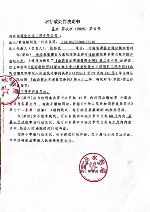 我局于2025年9月26日对河南邓通宝井业工程有限公司未经批准擅自凿井案作出行政处罚决定(盂水罚决字〔2025〕第6号)。因无法联系到当事人,行政处罚决定书被受送达人予以拒收,依据《中华人民共和国行政处罚法》有关规定,决定公告送达,履行行政处罚义务。自本公告发布之日起经过三十日,即视为送达。逾期未履行,本局将依法申请人民法院强制执行。